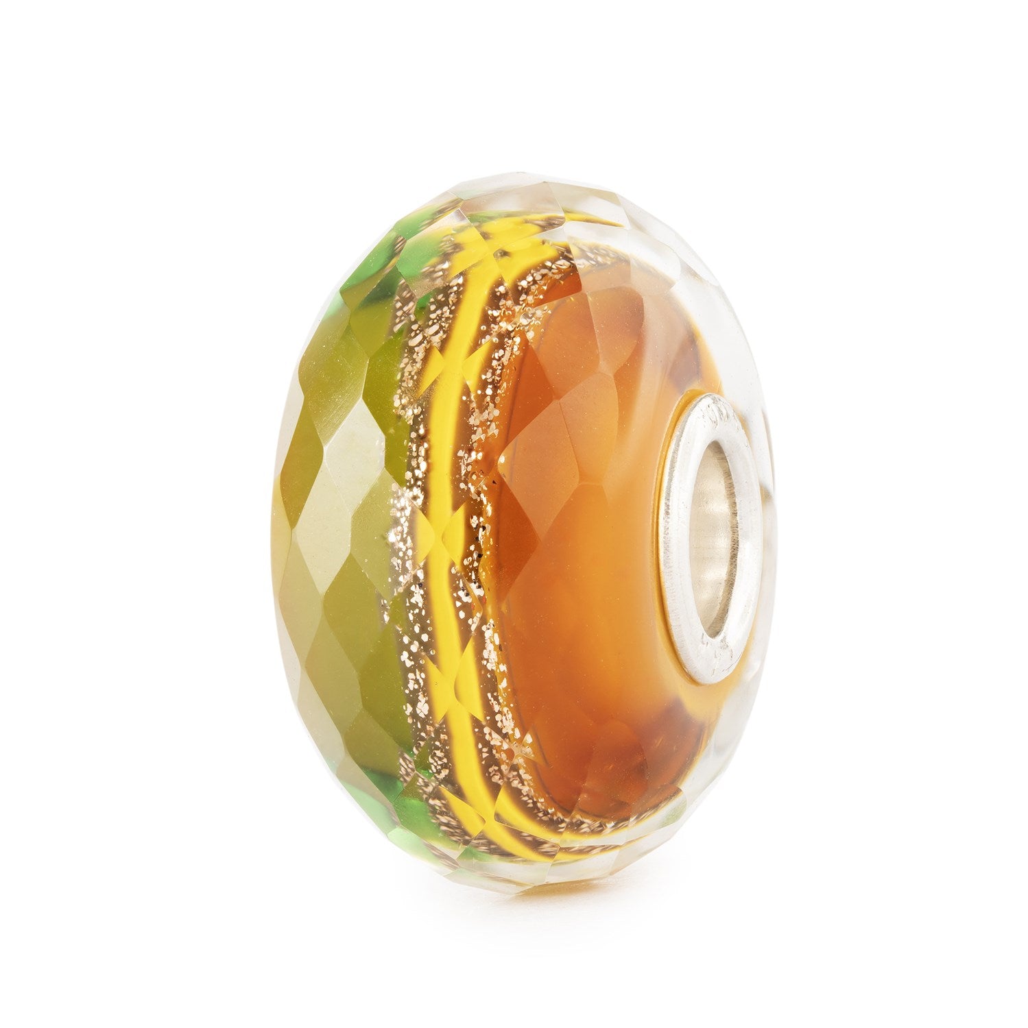 This glass bead has a facetted surface, gracefully reflecting the light and making you glow. This bead has a particular interesting design, green on one side, orange on the other. In between, a vibrant yellow line and golden glitter runs, expressing the comfort of Autumn while raditing fresh energy. A sterling silver core adds a refined finish, making it as enduring as it is radiant.